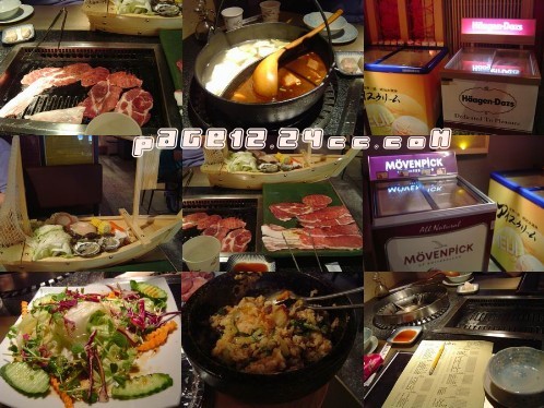 燒烤都是用點的,不是讓你在那撈來撈去的,種類很多,海鮮類、牛肉類、豬肉類、雞肉類、羊肉類、鮮蔬類、火鍋類、特別推薦類-海鮮煎餅、韓式泡菜、燒內生菜、海帶芽沙拉、石鍋拌飯、牛五花泡飯、鮭魚泡飯,另外啤酒、日本酒類是另外付費的,有無糖綠茶可以喝,還有三種冰淇淋任你挖--明治、哈根達司、摩門拼克(我自已翻的)三種都算不錯的冰淇淋