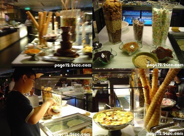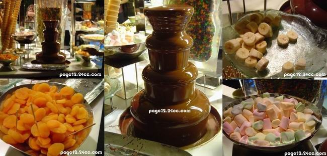 還有個很酷的巧克力鍋,一個很像捏陶的東西,全是巧克力醬汁,一直流動著,像瀑布一樣,原本還以為是個裝飾品,走近一看他居然是巧克力醬塔,你可以拿竹籤插水果或棉花糖去沾再放入盤子,很好吃喔,尤其是香蕉,而且我還失手把一個棉花糖掉到塔內,然後它就不見了,不知道這個東西是什麼構造,我好好奇喔,呵呵