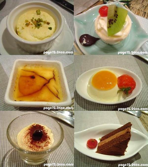 >甜點長的好可愛喔,左1烤布蕾 左2烤布丁 左3提拉米蘇 右1檸檬蛋糕 右2像荷包蛋的芒果點心 右3巧克力蛋糕