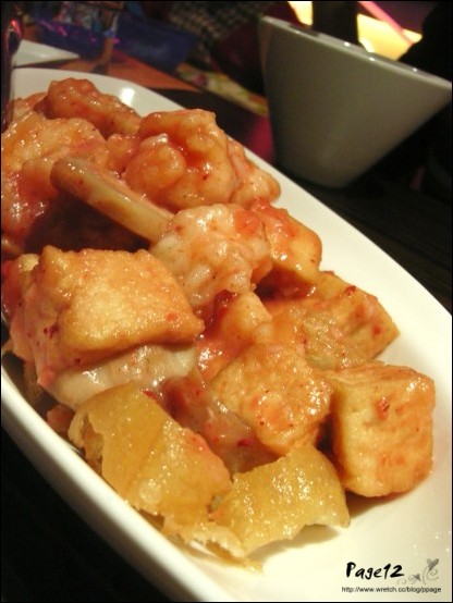 紅麴蝦輪豆腐$220 這個不是辣的,是加了紅麴,味道還滿特別的,甜甜的蝦球及豆腐,滿適合小朋友喔