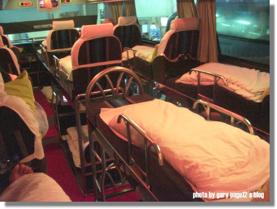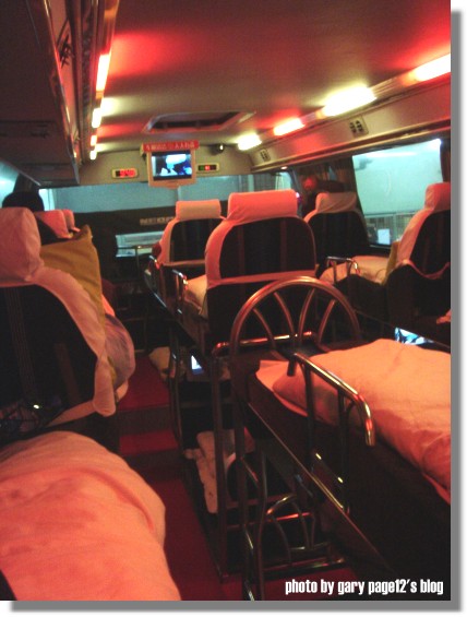嘿嘿,這個就是這次蓋先生從廣州到福州坐的臥舖巴士啦,我記得我在蘇州火車站看到的超破爛的,根本是左右兩層夾板,就直接頭朝窗戶腳朝走道這樣就睡了說,這個看起來很乾淨也,不過床是鐵的好像病床喔,好鬼異.....,然後長度不夠,腳好難伸,大陸滿多人不是都還滿高的,怎麼做那麼小呢