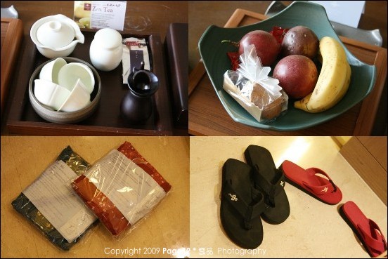 這邊提供了還滿講究的紅茶及迎賓水果及餅乾 浴衣和托鞋也是不可少的,我覺得他們黑色托鞋滿好看的,上面雲品的LOGO很配。不過一雙要290