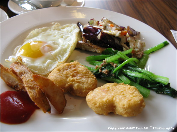 炒蛋、火腿、薯條、炸雞塊,哈,好棒喔,我最愛了,我記得小時侯我媽都買一大包立大炸雞塊放冷凍常常炸給我們吃也,帶皮的薯條最贊了