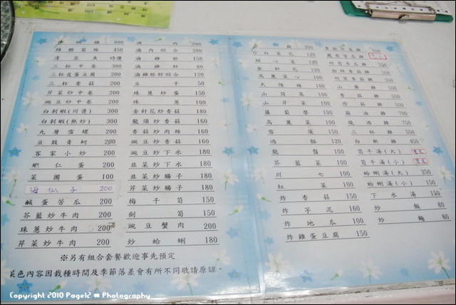 菜單,很多青菜都100元,滿大盤的,我還有很多青菜沒拍,因為小波吉有去鬧場,哈