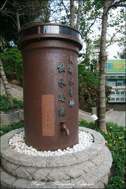 天母水管路的特色就是這個水管,特別取了一段水管造成這個造型,還有水龍頭,是因為山下居民的用水都是靠這水管接續,傳送下來的