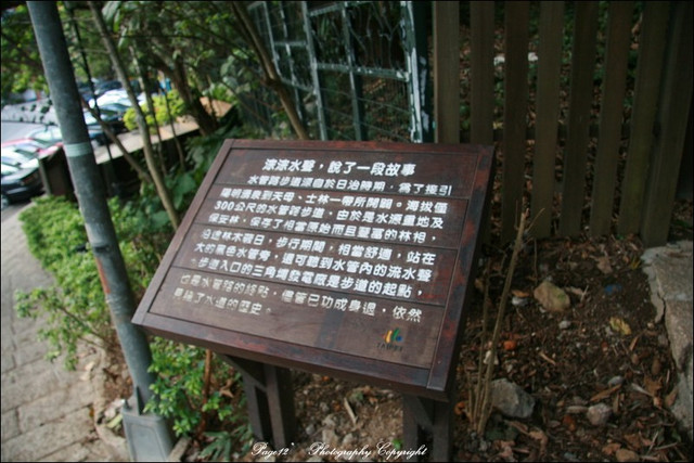 木頭立牌寫了水管路的由來,源自於日治時期,為了接引陽明湧泉到天母、士林一帶所開闢,海拔僅300公尺的水管路步道,由於是水源重地及保安林,保存了相當原始而且豐富的林相,步行期間相當舒適,漫步在這樣的水管路步道,欣賞沿途的森林景觀,呼吸著來自大自然新鮮的空氣,十分樂活的感覺