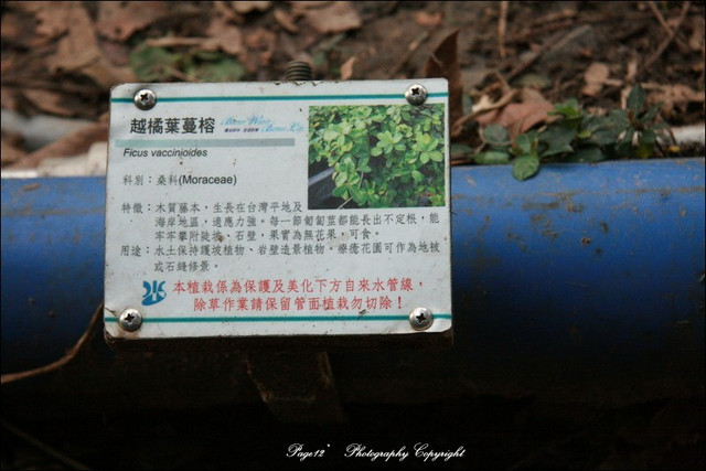 水管上面有著介紹植物的名字,除了中英文介紹,還有特徵,而且旁邊還有圖片,除了爬山之外,對於孩子能認識植物富有教育的意義,認識大自然,相當的不錯,而且這些植物主要為保護及美化自來水管線,所以還特別註明除草時別把這些可愛的植栽給切除囉
