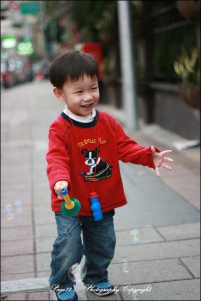 在充滿異國情調的街上,小波吉開心的在哈根達司餐廳外面吹泡泡