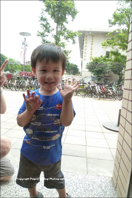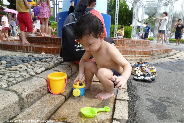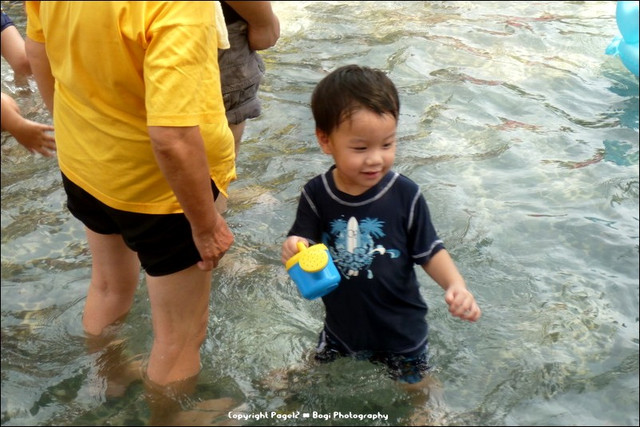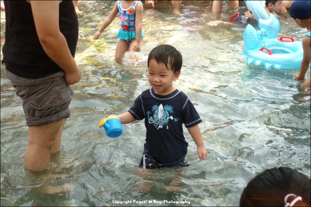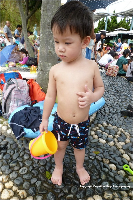 還好我帶了幾個挖沙工作來給他玩,不過沒帶他的小車車泳圈