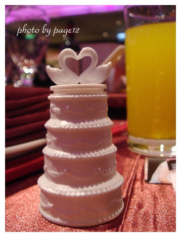 這個是今天剛剛參加的華漾婚禮桌上放的[天鵝蛋糕泡泡水],很可愛吧,這對新人也是有發金莎花,不過我沒拿到,這些人客真可怕,看到新人進場後,就一擁而上,搶拿金莎花呢,穿著美美的我,當然要留些氣質給人家探聽呢,就乖乖坐著