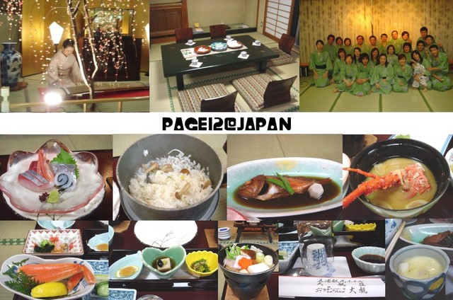 好像開了滿久的車,來到了鄉下,天色已晚,接近7點,黑鴨鴨的一片,有幾間溫泉旅館,我們進入到我們住的旅館,有一個穿著和服的女生正彈奏著琵琶,我們趕緊換了衣服,去泡溫泉,這裡的和服是綠色的,滿可愛的感覺,我們趕緊去泡泡湯之後就下去用餐了,終於,坐在搭搭米上,開始享用我們的除夕晚餐,日本的東西都弄的好精緻,盤子特多,晚餐有一個小火鍋、飯、生魚片、日本醃漬物一堆,今天還另外加點了一些炸物,及豐富我們的除夕晚餐,總之吃的很飽就回房間睡覺了,今天的旅館很普通,一點點舊,但感覺還滿特別的,有懷舊的感覺