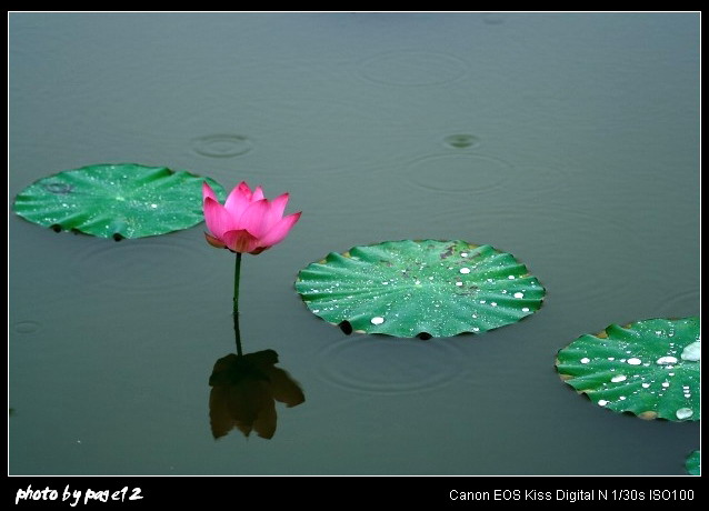 ,葉子上面還有一個洞,花如果美一點,遮光讓水面變黑,然後有水滴下來形成圈圈會很好