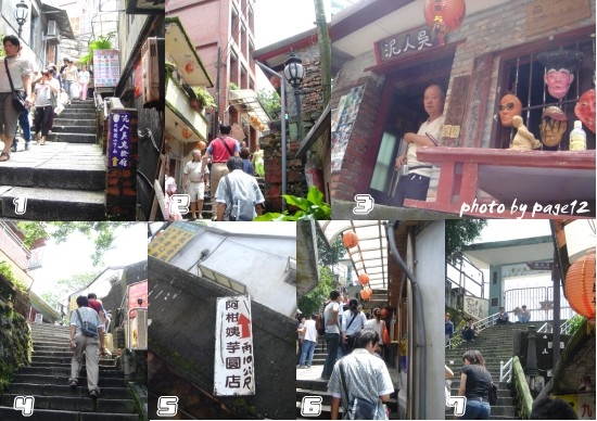 1.從基山路左轉豎崎路一直上山會先看到泥人吳的指標2出現凌亂的民宿3.泥人吳出現了,裡面都是些面具喔4.續往高高的階梯前進5.發現了阿柑姨芋圓的指標還有10公尺6.發現買芋圓的人龍7.還有更高的九份國小