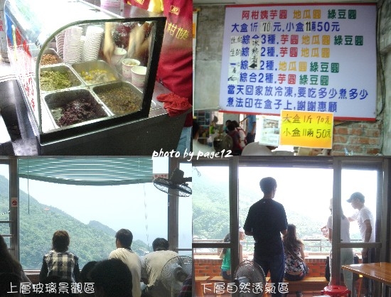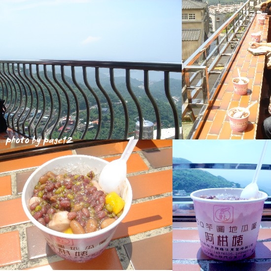 說到這家芋圓可久囉,在他都還沒什麼客人的時侯,我們就是他們的忠實顧客了現在排隊的人潮有一年比一年長的趨勢,反倒是有名的阿婆芋圓,現在生意比較沒那麼好,我們坐的位子,從一開始的人家屋頂的平台坐著長板凳,三不五時就霧茫茫到像在雲中吃芋圓,到現在的玻璃惟幕景觀窗,一過就是九年,不變的是芋圓一樣的好吃,且景觀依舊,正愁著沒位子坐的時侯,一個弟弟指引了我們方向,樓下有位子喔,原來他們又擴寬了樓下一層,樓下完全沒半個人,我們說這裡是老顧客的VIP,還有一張古董床在那也,這樓下的VIEW也不錯,沒有玻璃,景觀更清晰了,雖然太陽很大但今天的天空有些灰濛,看不太清楚,但晒晒太陽吃著冰,也是另一種享受