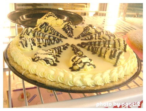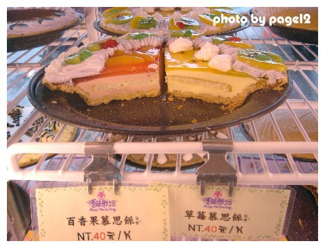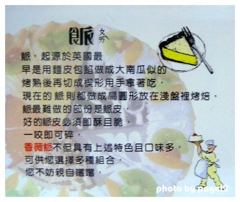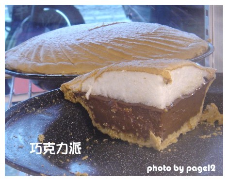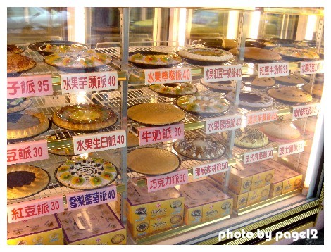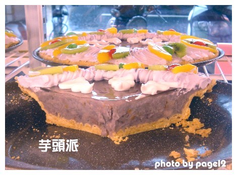 我們就散步去尋找香薇派,走過一大片的公園,後來才發現這公園是板橋火車站啦,哈哈,真的是台北ㄙㄨㄥ/,人家都嘛很少去台北縣啦,真的都不認識路呀,颱風的雨已經開始漸大,我們先坐在站牌那躲雨,一來也是走了一段路有點累,這才發現,啊....香薇派坊就在對面也,剛完鹹的,來點甜的吧,順便躲雨去,於是我們點了一個提拉米蘇$45、法式乳酪$50、紅豆牛奶$35,這三種都各有特色,因為我們的肚子空間有限,只點了三種試試,這最好吃的部份,除了濃濃的餡料之外,下面脆脆的餅皮是我的最愛,好香好好吃,這邊還有幾張桌子,賣些簡單的紅茶飲料,讓大家可以坐下來品嚐,來外帶的人潮幾乎沒有停過,可見它的美味喔