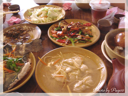 點了六六大順套餐,清蒸鱒魚、客家小炒、薑絲大腸、梅干肉、青菜、湯$1000元,這樣的量大概是五個人吃剛好