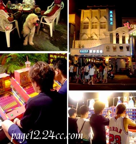 還看到一堆古代牧羊犬,大概有六隻吧,好大喔,好可愛,我還在旁邊的店買了一條皮手環,後來我們就散步到街上,超級熱鬧人也好多,街道二旁都是人,車道則是有點塞車,好多賣魯味的人都好多喔,也有看到不少民宿相當漂亮,圖片右上角的南島旅店就很有希臘的感覺,不過我想住這一定滿吵的,還有一堆打彈珠及射飛標的攤子,我們玩的很高興,還有去特色的衣服店逛逛,不過沒有買東西,還有彈跳的器材在那,小朋友和大人都可以上去跳,綁住身体,然後你二手抓著繩子,隨著彈簧就可以彈的很高喔