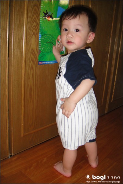 雖然是看起來瘦瘦的,但上週很熱穿上這大大的棒球衣,看起來還滿圓的,哈