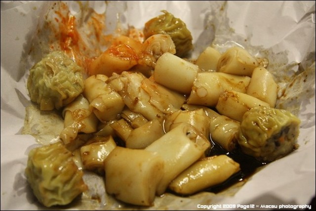 後來說,你們台灣來的后,那是要加辣,哈,澳門人知道,台灣來的都要加辣,好好笑喔,他是用紙包著,然後再放到塑膠袋裡,我們就把紙攤開就吃了