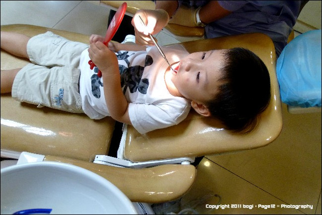 小波吉一開始就乖乖的自已坐上去了,然後醫生拿鏡子叫他拿著,我就在旁邊說醫生要看看有沒有蛀牙蟲喔,然後醫生叫他「阿」他就「啊」!