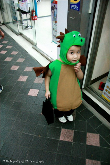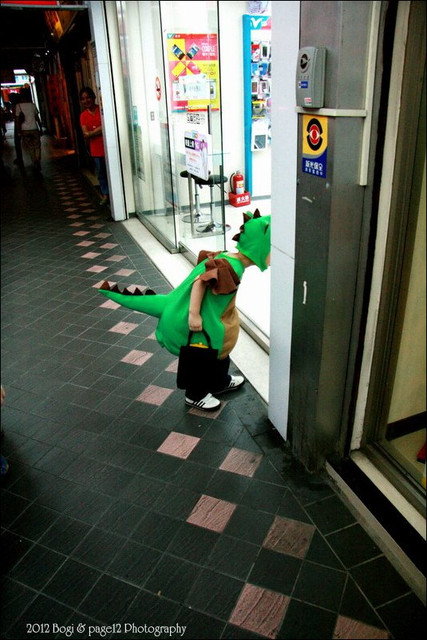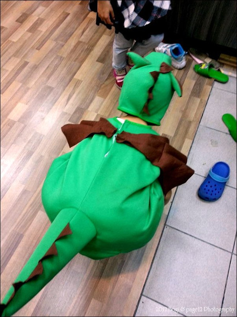 整個太熱,天氣太好了,穿著吊嗄啊小背心加恐龍衣,滿身大汗,不時脫掉恐龍帽
