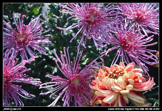 我沒忘記老師的拍花要點,只是,我找不到像鬱金香和荷花一樣的主體,我的攝影眼,脫窗了,SORRY,所以拍了一堆好像旅遊照的東西,超傷心的,不過話說因為菊花是人工的,用支架架著,一朵朵沒有什麼擬人法可以幻想 <<<<<<<<<<你看看拍不好又要怪花了唉