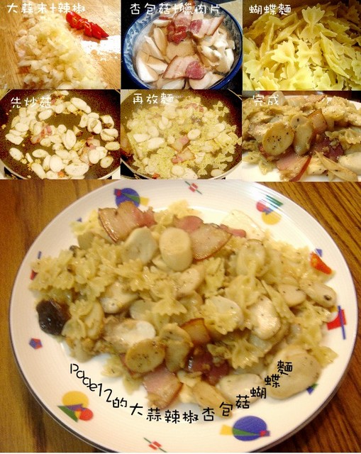 平底鍋加入少許橄欖油,加入蒜頭辣椒爆香,杏包菇及臘肉切片丟入,再加入黑胡椒粉、鹽、義大利香料,等杏包菇半熟就可以加入煮過的義大利麵,再翻二下就可以了