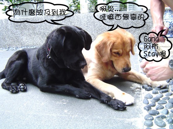 其實像這些把戲都有傳授給後來的主人,他們也有常常練習,Gama才不會忘記,我們就來測試,連他們家的阿布也一起來,二隻狗狗原本是先看著我們手上的小餅乾,然後我們就放在牠的手上,然後叫牠stay,如果有要動的跡象就提醒牠stay喔,不行喔,牠就會很無辜的看著餅乾,通常我們會等10秒鐘左右,然後直到牠們看到出神,突然叫,ok!!,有時Gama還會恍神沒聽到,我們再大聲說"ok!!",牠才像幾天沒吃飯一樣,快速吃掉牠的餅乾
