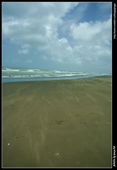 風吹的整個沙往海裡流動,我們趕緊背對著風沙