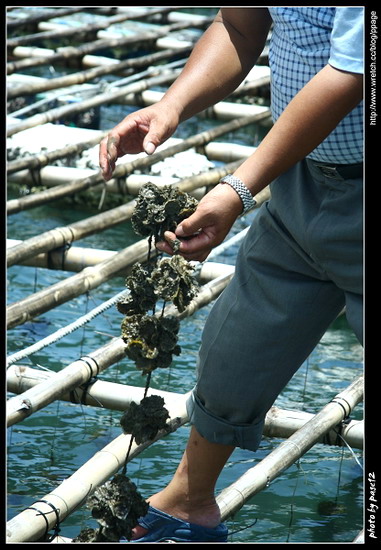 我們坐的船很可愛喔,上面還有蚵殼做裝飾,後面那個是開船的船長大人,正在手腳並用中
