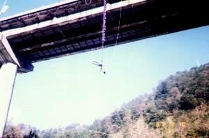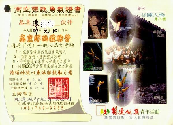 記得當時年記小,六年囉,日子過的好快,那時參加畢業旅行,由旅行社包辦的,我們有個特別的行程,就是高空彈跳 X 無限次,棒吧,反正在谷關那,就在橋上裝了那些設備,然後就輪流,要跳的人就排隊綁裝備,結果好像只有班上的1/4參加吧,而跳的女生,只有二個,其中一個是我,我是選擇綁身体的,第一次不行綁腳,怕姿勢不對會受傷