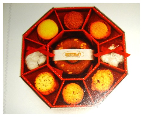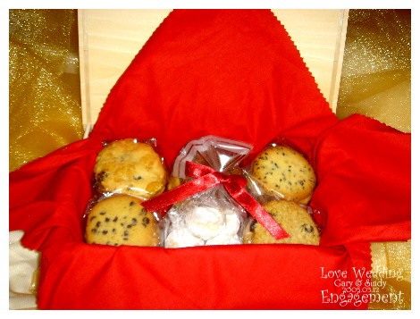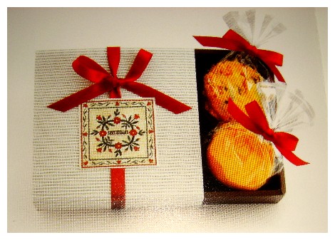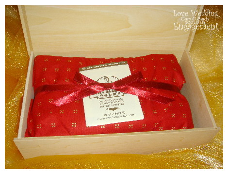 打開木盒是用紅色緞帶及紅色的小碎花布,還有餅乾的簡介
