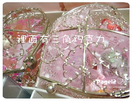 金屬心型盒很漂亮,裡面裝了包了粉紅色紗紗的三角巧克力