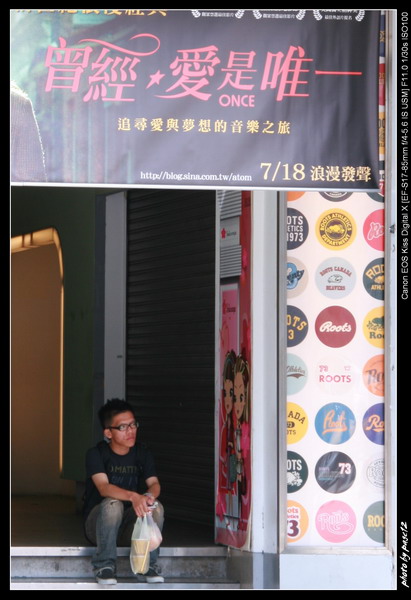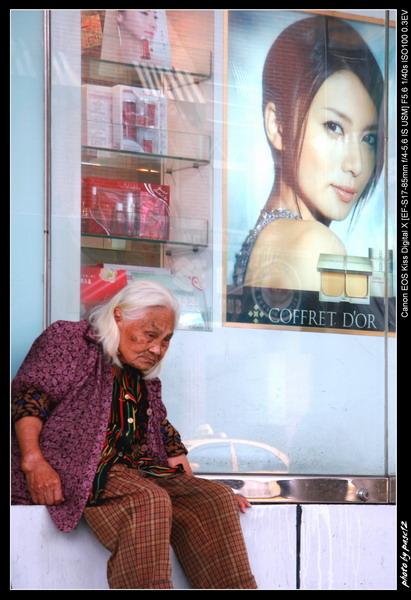 這個阿婆一年前苑如拍過,一年後她還是在西門町遊盪,昭翰說他剛有拍一張,她在別的地方,我們要小心,她會罵人喔,所以要偷偷的,我們幾個就說,是后,然後我們慢慢從他身邊走過,後來我說,你們看他旁邊有美女照片,可以來構個曾經年輕過,而且是黃金構圖點也,哈,然後大家都不死心的站四公尺遠,然後小心偷拍又走掉又拍又閃,哈