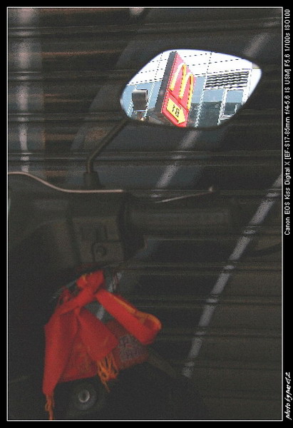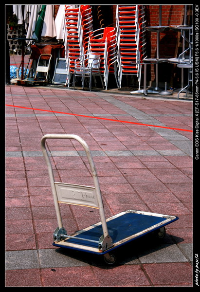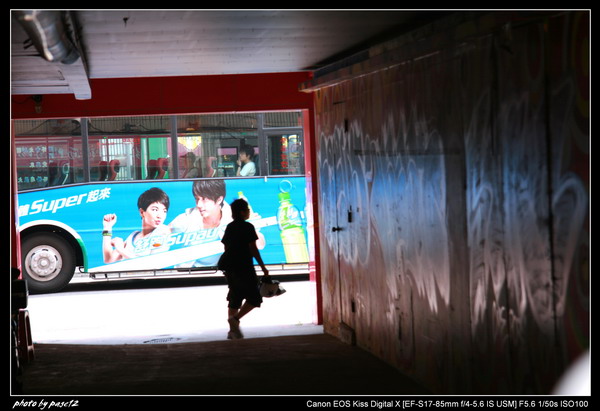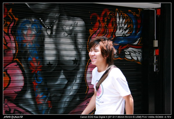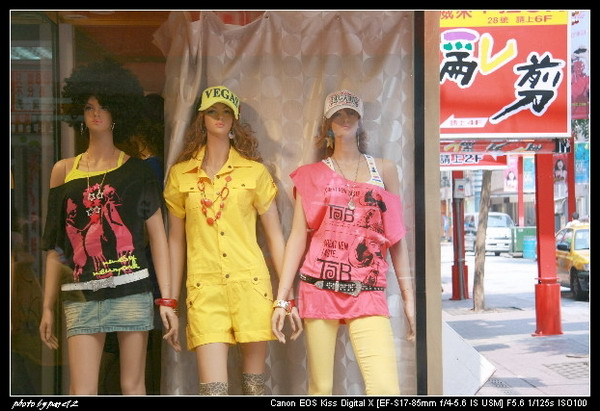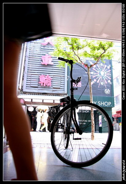 欣怡注意到這邊有大車輪,我看到摩托車,不然說後輪給他誇張,不過一點都不適合,好死不死一台卡打車停在對面美觀園門口,但是那位阿伯一直在翹位置停車,我們繞一圈回來,沒想到,完全沒觸碰到任何東西,就構了這樣的畫面,不過真的很難翹,這時西門町辣妹已經人來人往,然後我整個頭和相機到快地板了,我還拍到正妹的一雙美腿請見#24,還好我們二個是女的不然可能會被打,我們輪流一個人檔路人,一個人拍,然後有小剪一下旁邊才構成這樣,欣也有提到那顆樹好明顯,我說先拍了吧,樹又不能砍