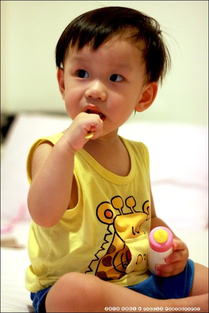 後來我都會拿水杯裝開水,然後給他一隻寶寶牙刷。在一歲前,他都是在咬牙刷咬好玩的,但我想刷毛有弄到牙齒就好了吧,一整個很隨緣