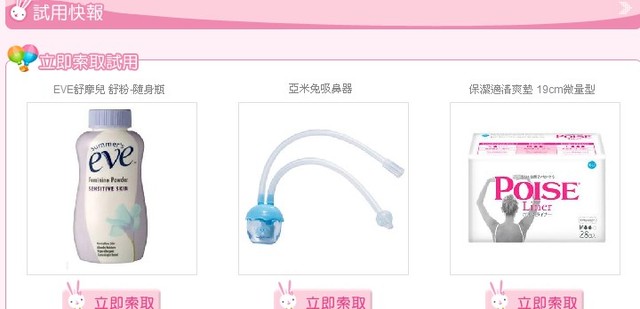 上面有很多試用品,沒事上去逛逛可以索取好多試用品喔,而且都很實用也。你有帳號了嗎,快來申請一個吧