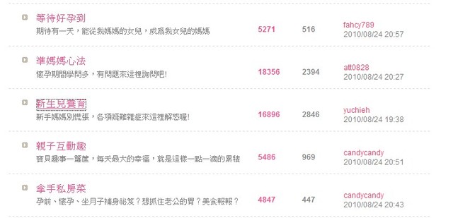 一般來說還會去上這個嬰兒與母親討論區「新生兒養育」區,畢竟新手媽媽有好多疑問啊,所以隨時有問題就上討論區發問,總是有些媽媽們可以提供一些參考意見,這樣也少了很多的疑問和擔心。