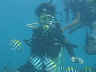 這次去峇里島玩一個很好玩的淺水活動,我們先是穿著防寒衣,然後試穿合適的蛙鞋,還有罩住鼻子的淺水鏡,著好裝備上了一艘小船,我們背著氧氣筒下海去,身上綁了不少鉛塊,不綁的話會浮起來,一個人配一個教練,所以我們都是與教練黏在一起的,教練要負責我們的安全,但其實,我們不是用黏在一起的,我們是被教練抓著,因為我們好像太空人啦,因為在水裡,不會控制方向,上飄也不是,下沉也沉不下去,連會游泳的蓋先生都是被教練抓著的命