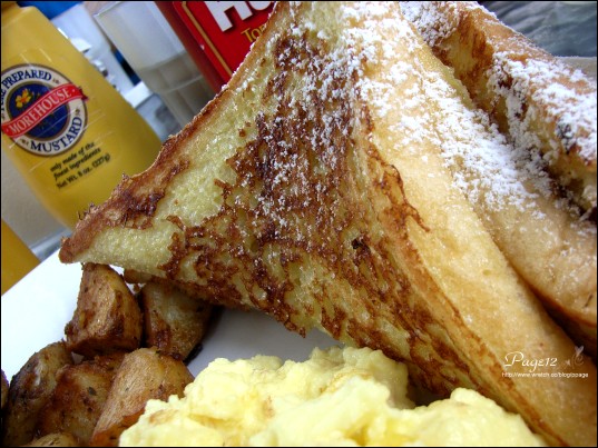 法式土司早餐(炒蛋、馬鈴薯塊、美式香腸),附一杯柳澄汁及美式咖啡