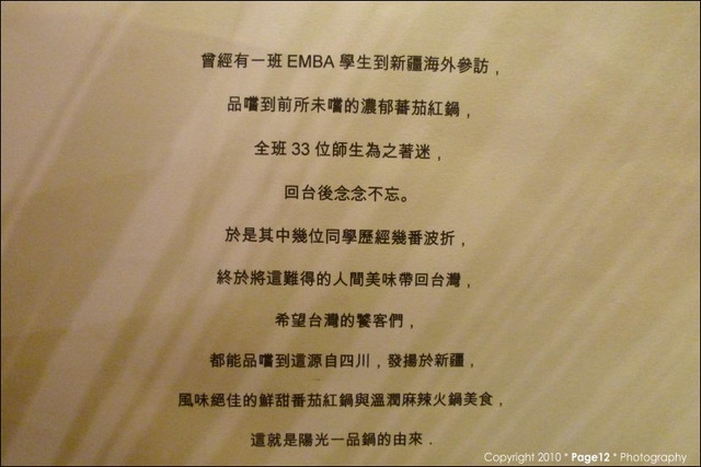 曾經有一班EMBA學生到新疆海外參訪,品嚐到前所未嚐的濃郁蕃茄紅鍋,全班33位師生為之著迷,回台後念念不忘。於是其中幾位同學歷經幾番波折,終於將這難得的人間美味帶回台灣,希望台灣的饕客們,都能品嚐到這源自四川,發揚於新疆,風味絕佳的鮮甜番茄與溫潤麻辣火鍋美食,這就是"陽光一品鍋"的由來