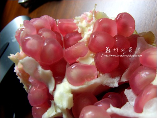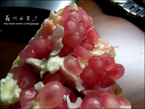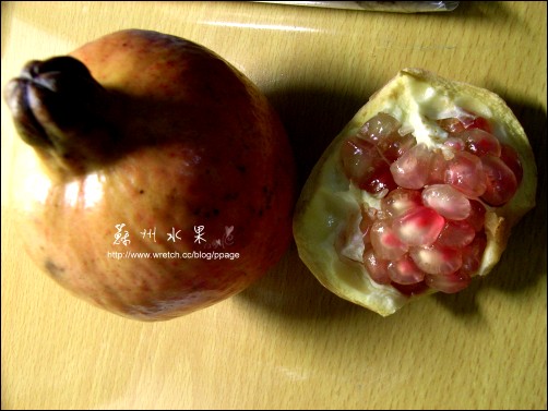 石榴在台灣不太容易買的到,有賣的話也滿貴的,吃起來有點麻煩,就剝開外皮後,裡面有一顆顆的紅色果子很像玉米的大小,每一顆裡面都有硬籽,所以我通常一口咬幾顆在嘴裡把汁吃掉之後吐籽,吃起來不是很方便,味道酸酸甜甜的,滿特別的,可能打汁喝起來比較方便