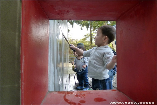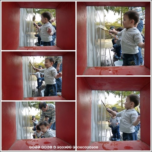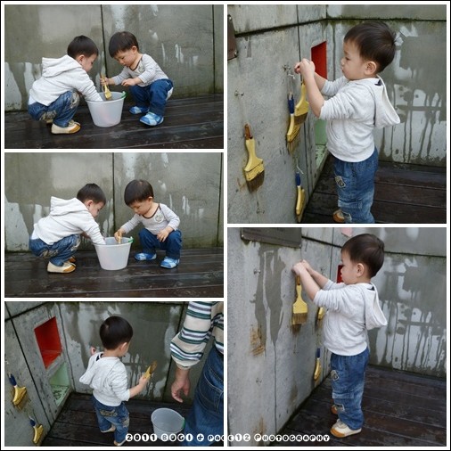 這邊有一區可以畫畫的地方,一面水泥牆在那,用水就可以畫~小波吉的表情好好笑,很開心的感覺