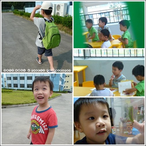 小波吉上學去day1- 早上媽咪坐計程車帶他去,送進教室,一開始有跑出來,後來一個妹妹牽他進去坐好(八成是煞到他),然後我先站在教室外等了一下,看他還滿ok的,就跟主任去樓下了,然後我就想回家了,但是拔拔叫我在那等,等什麼呀,他好好的呀